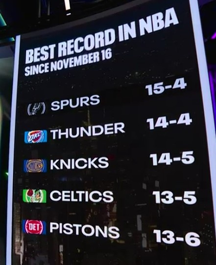 马刺主场迎战骑士,转播方晒出近一个半月(11月16日于今)的战绩名次:
